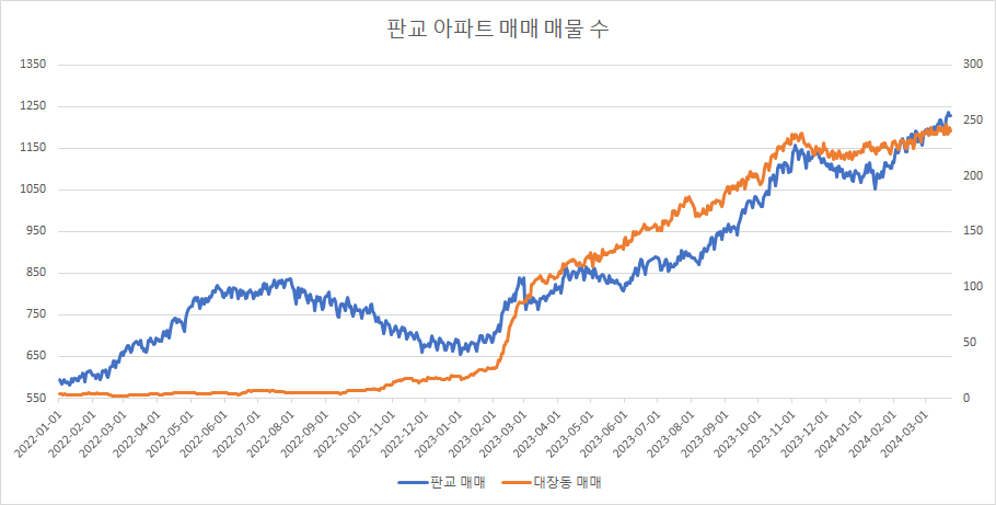 판교 각 지역별 아파트 매매 매물 수 변화를 보면, 판교 모든 지역(삼평동, 운중동, 백현동, 판교동) 아파트 매매 매물 수는 증가하고 있습니다.