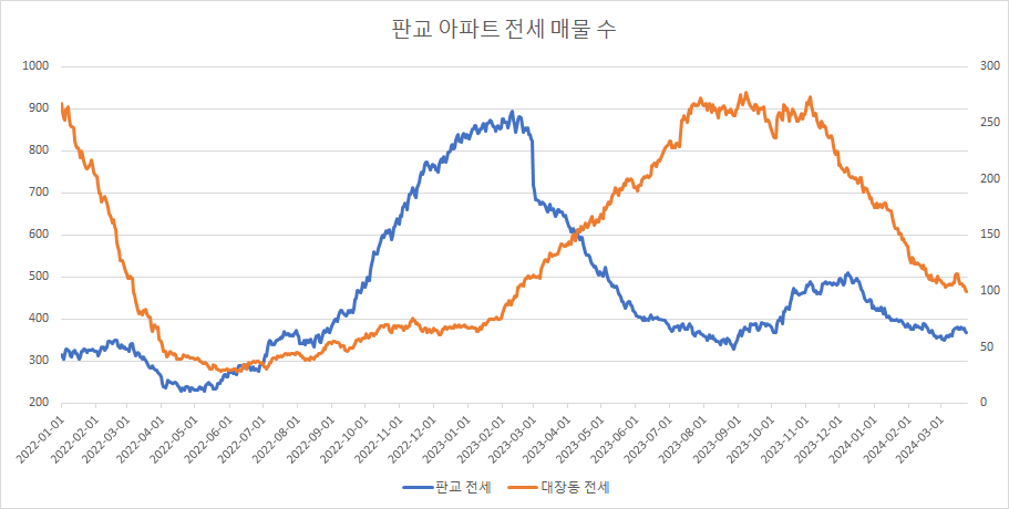 다음은 분당구 아파트 전세 매물 수 변화를 확인하겠습니다.