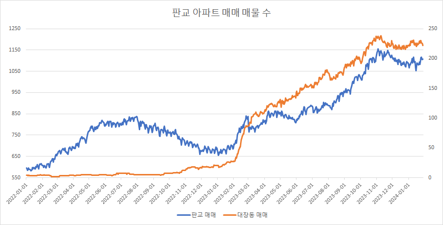 대장동 아파트 매매 매물 수는 주 단위로 증가와 감소를 반복하고 있는데, 이번 주에는 감소했습니다.