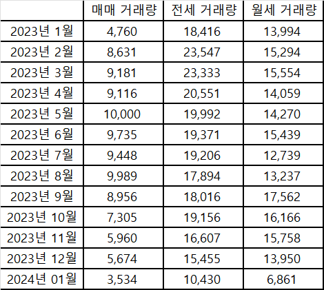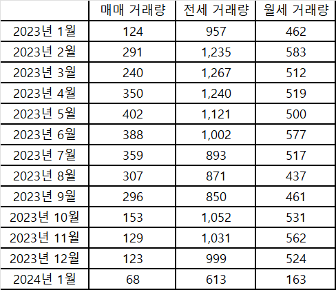 2023년 12월 말 즈음에 매매 거래가 반짝했었기에 월 후반으로 갈수록 거래량 증가가 가파르게 나올 것으로 기대했으나 많이 아쉽게 되었습니다.