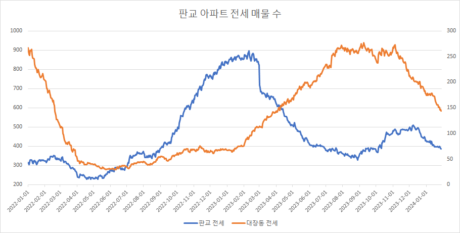 대장동 아파트 전세 매물 수는 12주 연속 감소하고 있습니다.