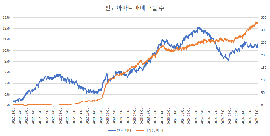 대장동아파트 매매 매물 수는 증가추세를 보이고 있는데, 이번주에는 지난주 대비 보합을 유지했습니다.