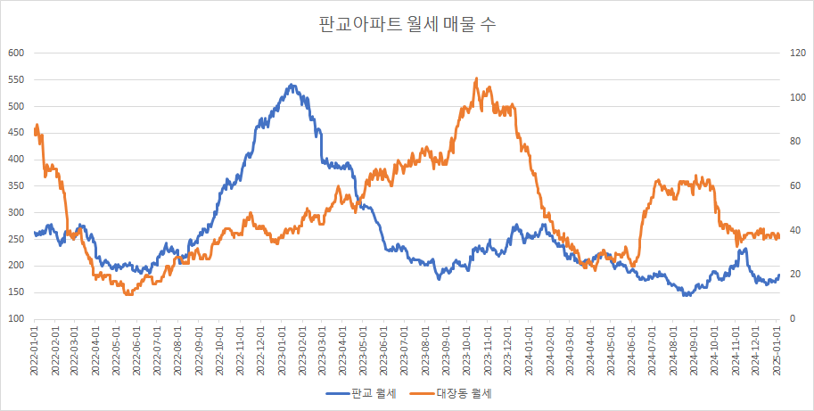 판교아파트 월세 매물 수는 바닥에서 횡보를 준비하는 듯한데, 이번주에는 증가했습니다.