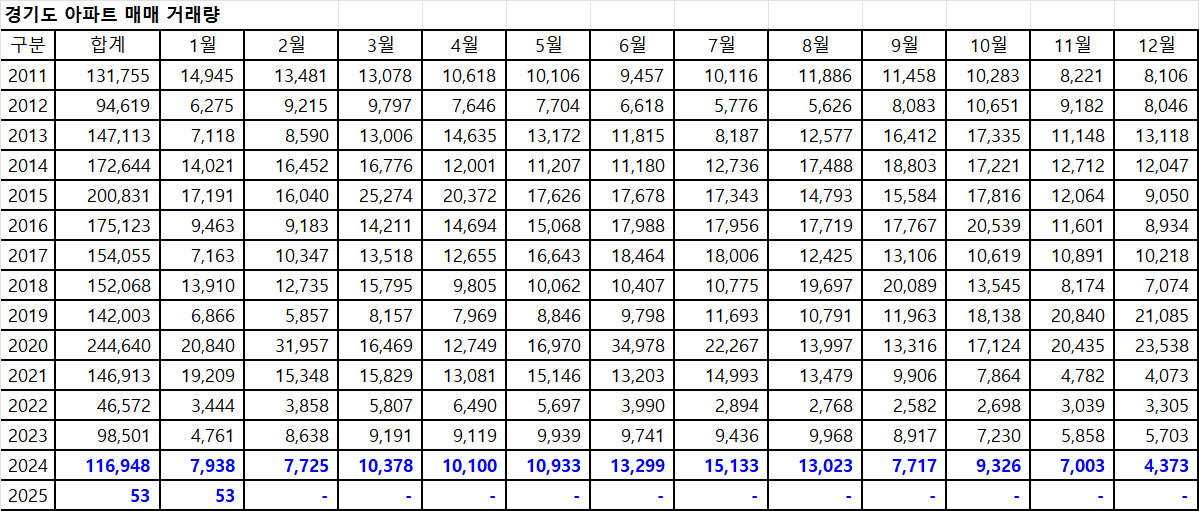 아래 표는 경기도아파트 매매 거래량입니다.