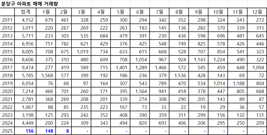 2월 분당구아파트 매매 거래량은 현재 8건입니다. 이 데이터로 2월 분당구아파트 최종 매매 거래량을 예측해 보면, 약 228건입니다. 1월 분당구아파트 매매 거래량이 연휴로 감소했는데, 연휴가 끝난 2월 초부터 아파트 거래량이 급증한 것으로 보입니다.
