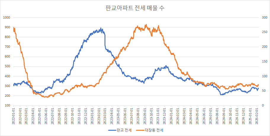 대장동아파트 전세 매물 수는 지지난 주에는 감소했으나, 이번 주에는 다시 증가했습니다.