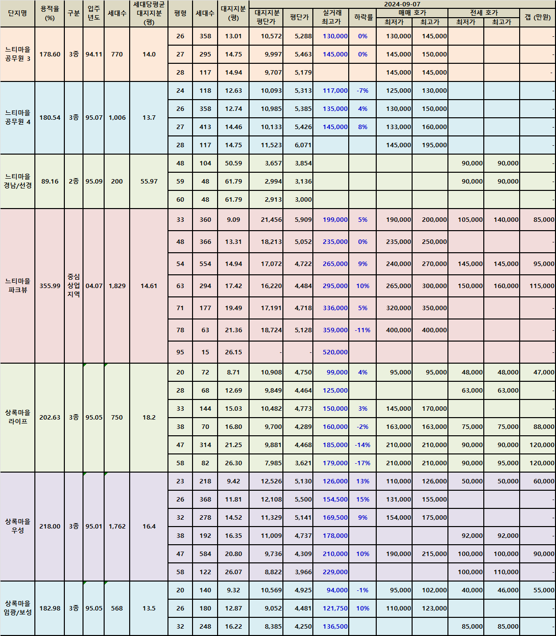 정자동 느티마을과 상록마을아파트의 매매가를 전수 조사 후 매매 최저가가 실거래가 최고가 대비 10% 이상 하락한 매물을 정리했습니다.