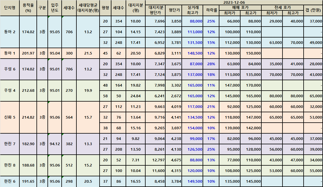 아래 표에서와 같이 정든 마을 아파트의 경우 20평대 소형평형 아파트는 매매 최저가가 실거래가 최고가 대비 20% 이상 하락한 매물이 있습니다.