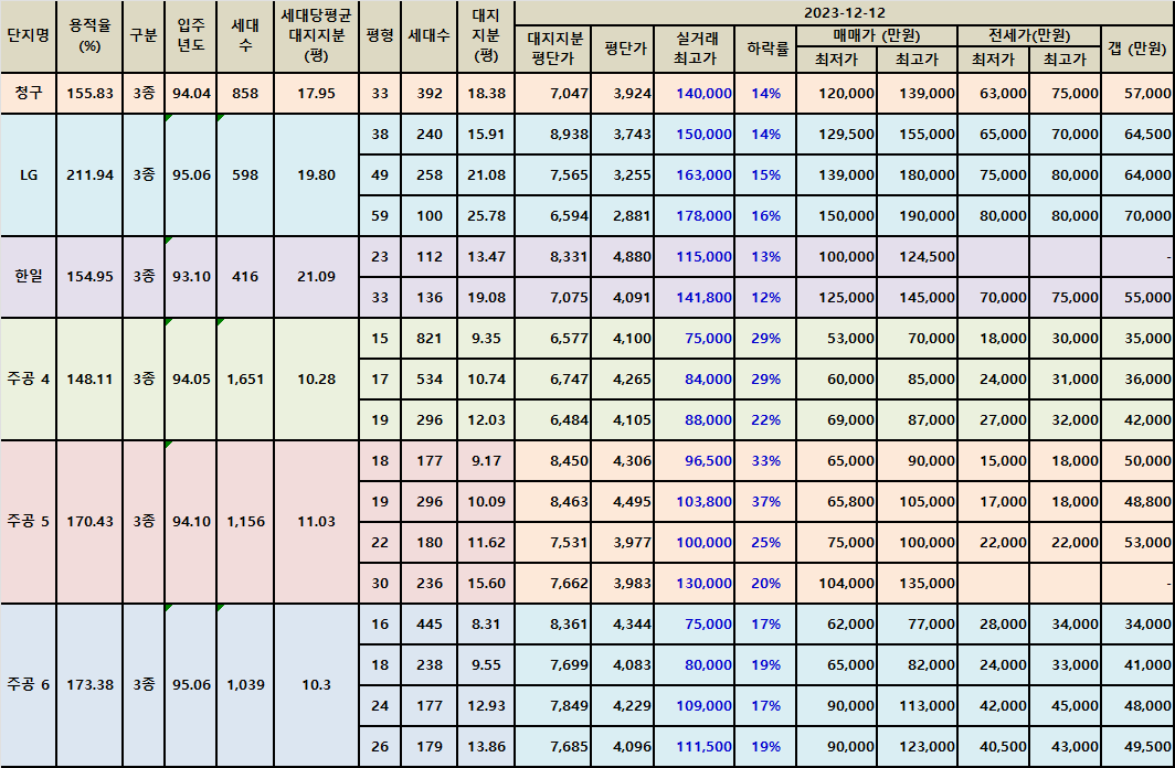 아래 표에서 보듯이 주공 4, 5, 6단지의 소형 평형의 매매가의 하락율이 아직도 실거래가 최고가 대비 30%가 넘는 하락율을 보이는 곳이 많습니다.