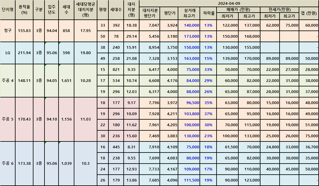 그 외 단지에서는 매매 최저가가 실거래가 최고가 대비 모두 10% 대의 하락율을 기록하고 있습니다.