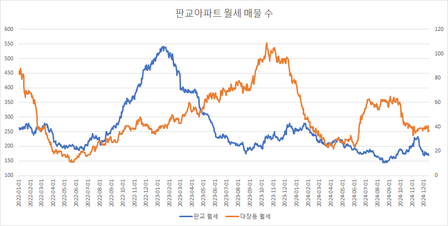 대장동의 경우 입주 2년 차에 가격조정 등을 거치지 않았고, 매물 소화도 거의 이루어지지 않았습니다. 그러한 것이 이제 입주 4년 차가 되어 가면서 시장에 영향을 주는 듯합니다.