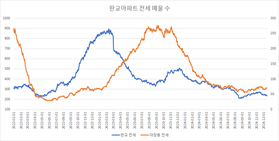 판교아파트 전세 매물 수는 5주 연속 감소하고 있습니다.