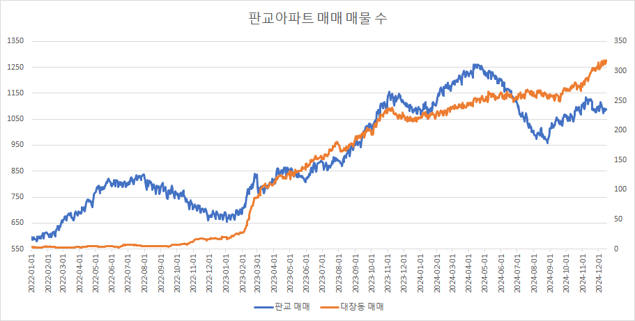 대장동의 경우 입주 2년 차에 가격조정 등을 거치지 않았고, 매물 소화도 거의 이루어지지 않았습니다. 그러한 것이 이제 입주 4년 차가 되어 가면서 시장에 영향을 주는 듯합니다.