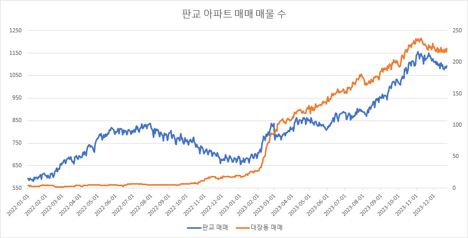 대장동 아파트 매매 매물 수는 고점에서 하락을 있어오다가 최근 들어서 횡보를 하고 있습니다.
