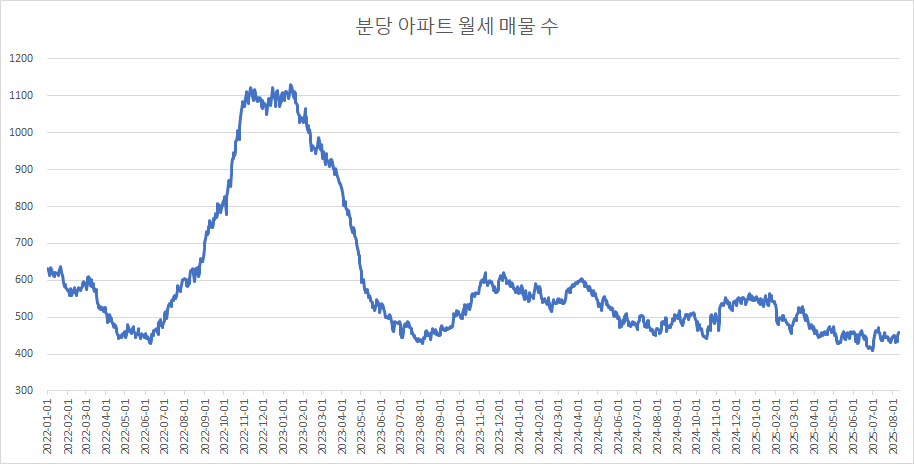 분당아파트 월세 매물 수는 바닥권에서 횡보 중인데, 이번 주에는 증가하고 있습니다.