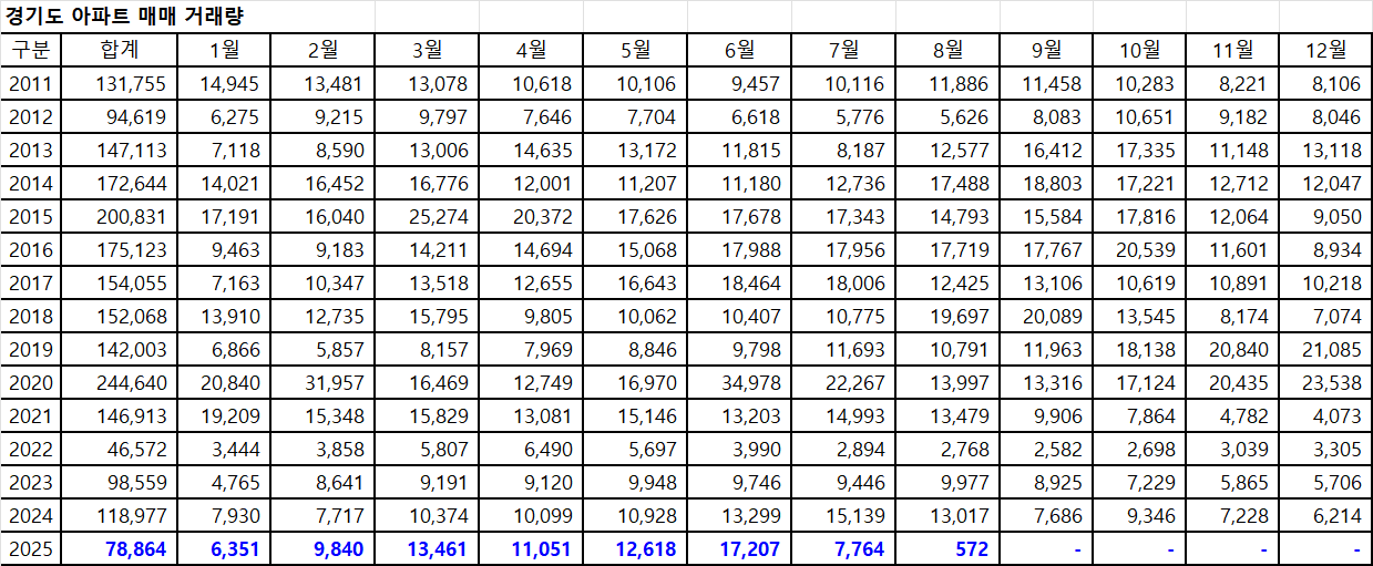 아래 표는 경기도아파트 매매 거래량입니다.