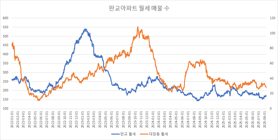 판교아파트 월세 매물 수는 증가와 감소를 반복하면서 느리게 감소하고 있는데, 이번 주에는 지난주 대비 보합을 유지했습니다.