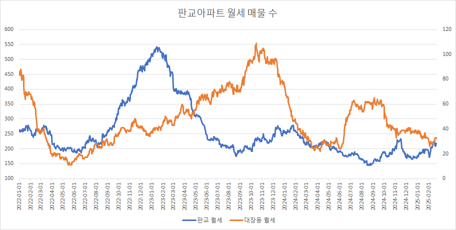 대장동아파트 월세 매물 수는 지난주에는 보합이었으나, 이번 주에는 증가하고 있습니다.