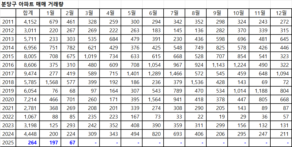 2월 분당구아파트 매매 거래량은 현재 67건입니다. 이 데이터로 2월 분당구아파트 최종 매매 거래량을 예측해 보면, 약 260건이 됩니다. 분당구 부동산 시장이 아직은 움직이는 모습을 전혀 보여주지 못하고 있는데, 그럼에도 200건이 넘는 거래량이 예측된다는 것은 다행이라고 할 수 있으나, 경기도아파트 2월 매매 거래량 예측치에 비해서는 너무나 실망스러운 데이터입니다.