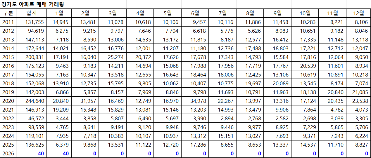 1월 경기도아파트 매매 거래량은 현재 40건입니다. 아직은 데이터로써의 신뢰도가 없지만, 그럼에도 이 데이터로 1월 경기도아파트 최종 매매 거래량을 예측해 보면, 약 6,222건이 됩니다.