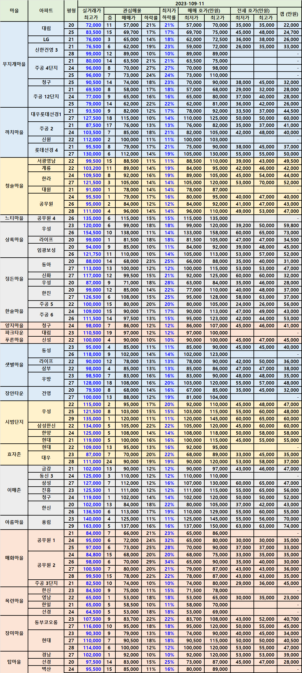 8월부터 거래량이 많이 줄어들면서 일부 마을에서는 가격이 다시 살짝 밀리고 있는 모습입니다.