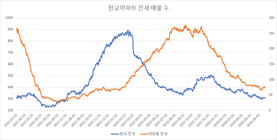 대장동아파트 전세 매물 수는 감소 추세를 이어가지 못하고 있는데, 지난주 대비 보합을 보이고 있습니다.