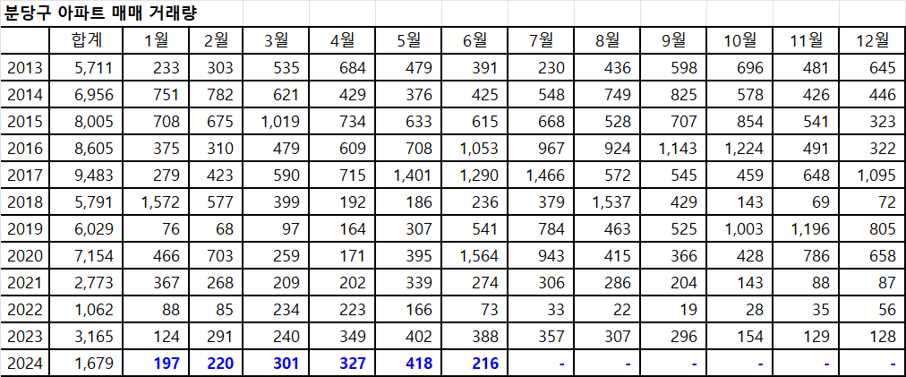 6월 분당구아파트 매매 거래량은 현재 216건입니다.