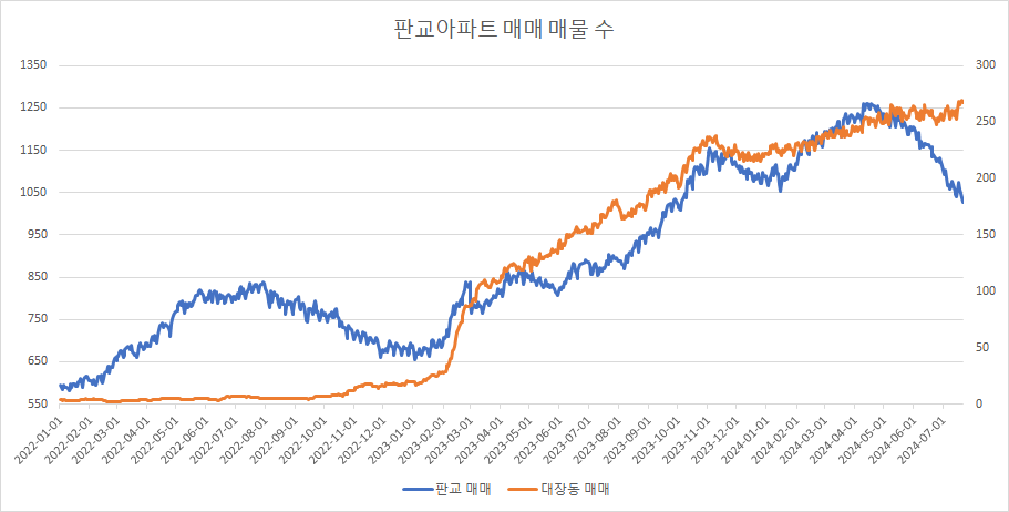 대장동아파트 매매 매물 수는 고점에서 횡보하다가 살짝 증가로 방향을 잡는 듯한데, 이번주에는 지난주 대비 증가했습니다.