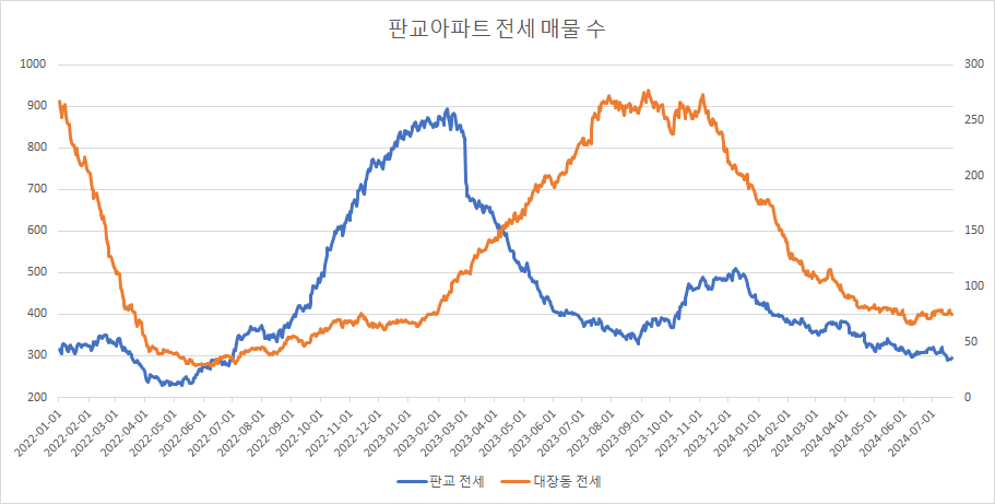판교아파트 전세 매물 수는 3주 연속 감소하고 있습니다.