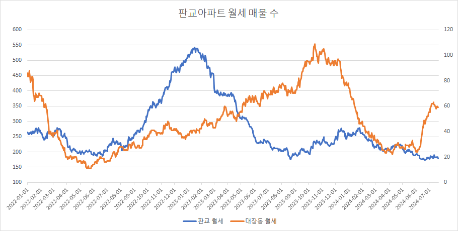 대장동아파트 월세 매물 수는 최근 급증 후 숨 고르기 중이었으며, 이번주에는 지난주 대비 보합입니다.