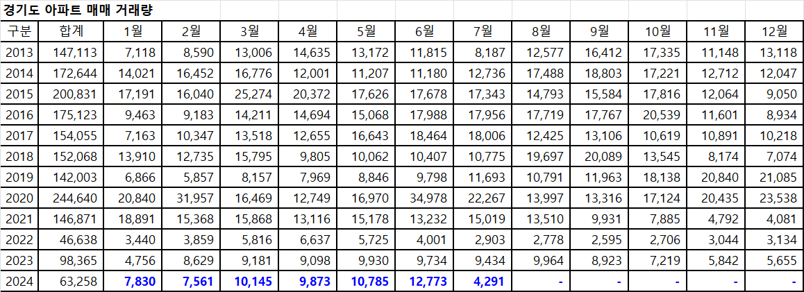 아래 표는 경기도아파트 매매 거래량입니다.