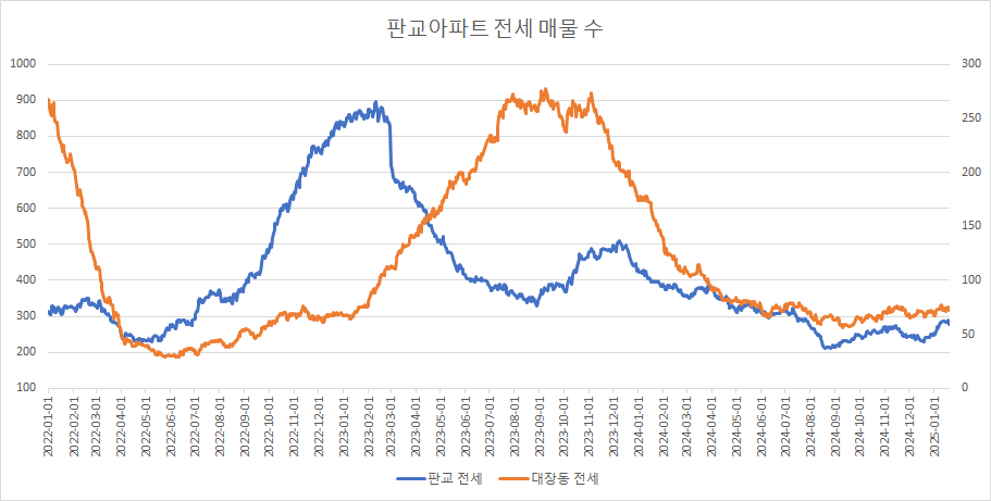 대장동아파트 전세 매물 수는 2주 연속 보합을 보이고 있습니다.