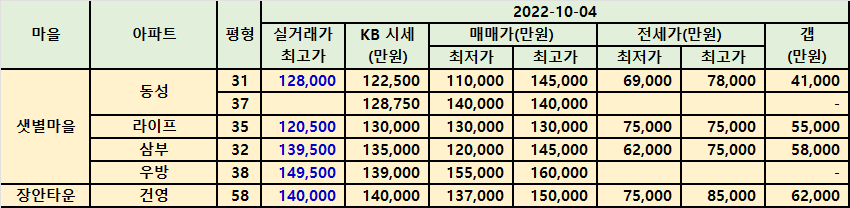 분당동 샛별마을 및 장안타운 매물 정리입니다.