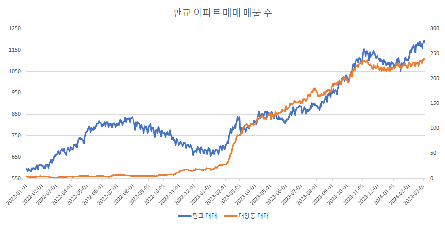 대장동아파트 매매 매물 수는 고점 부근에서 횡보하는 듯했으나, 이번주에는 다시 증가로 돌아섰습니다.
