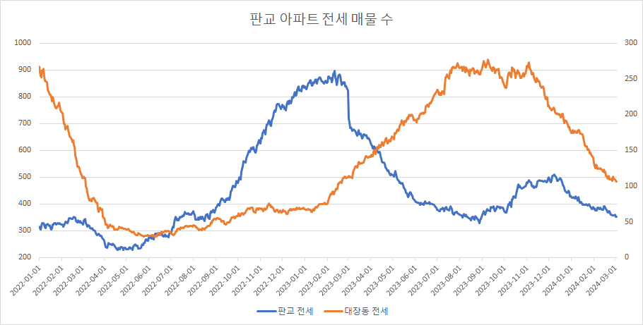 대장동아파트 전세 매물 수는 17주 연속 감소하고 있습니다.