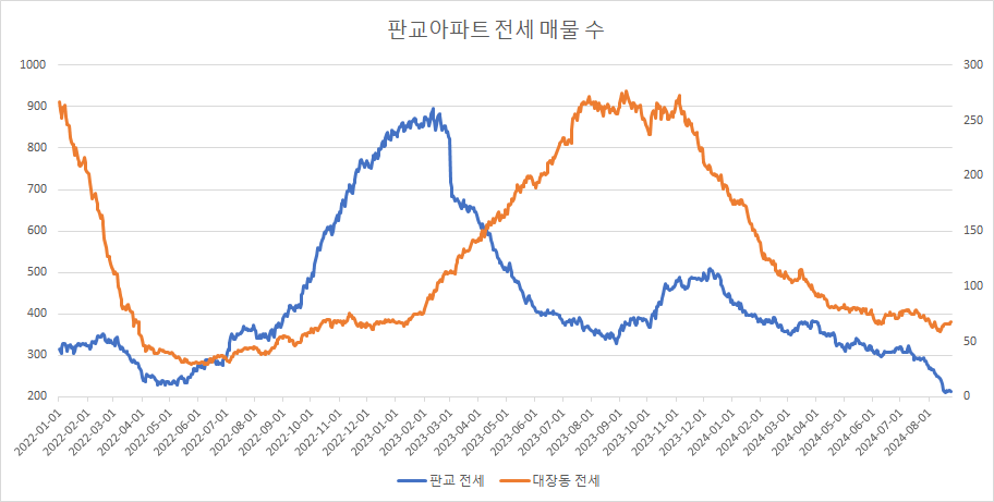 대장동아파트 월세 매물 수는 급증 후 최근 2주 연속 보합을 보이고 있습니다.