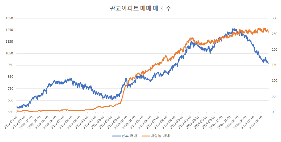 대장동아파트 매매 매물 수는 증가와 감소를 거듭하면서 조금씩 고점을 높여가고 있었으나, 다시 2주 연속 감소하고 있습니다.