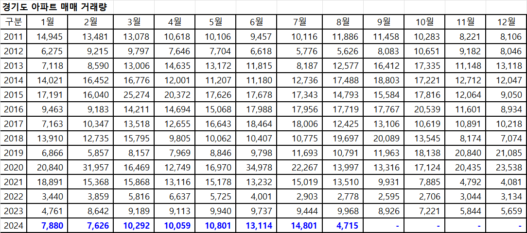 경기도아파트 8월 매매 거래량은 현재 4,715건입니다. 이 데이터를 기반으로 8월 경기도아파트 최종 매매 거래량을 예측해 보면, 약 12,203건이 됩니다.